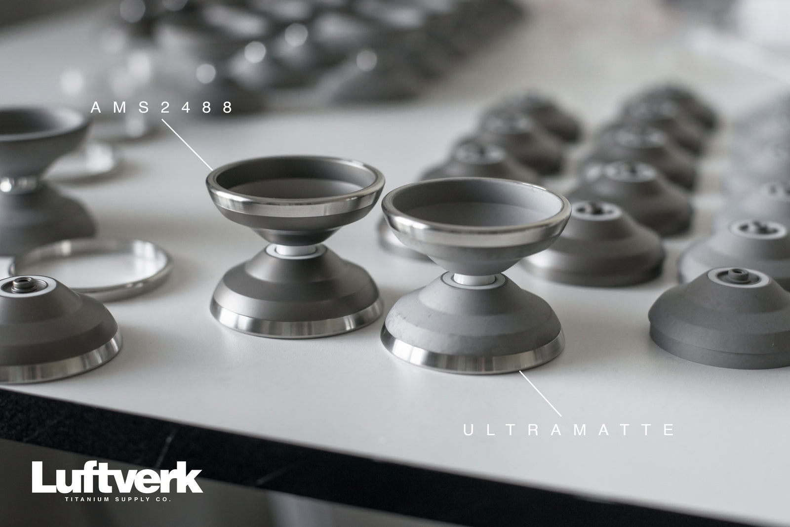 I get a lot of questions asking about these two very different finishes. I figured it would probably make sense to have a specific blog post regarding this I could link to in the future. Both Ultramatte and AMS2488 are titanium specific coatings, generally reserved for fasteners in the aerospace and medical industry but their functions as a coating for yoyos are very different.