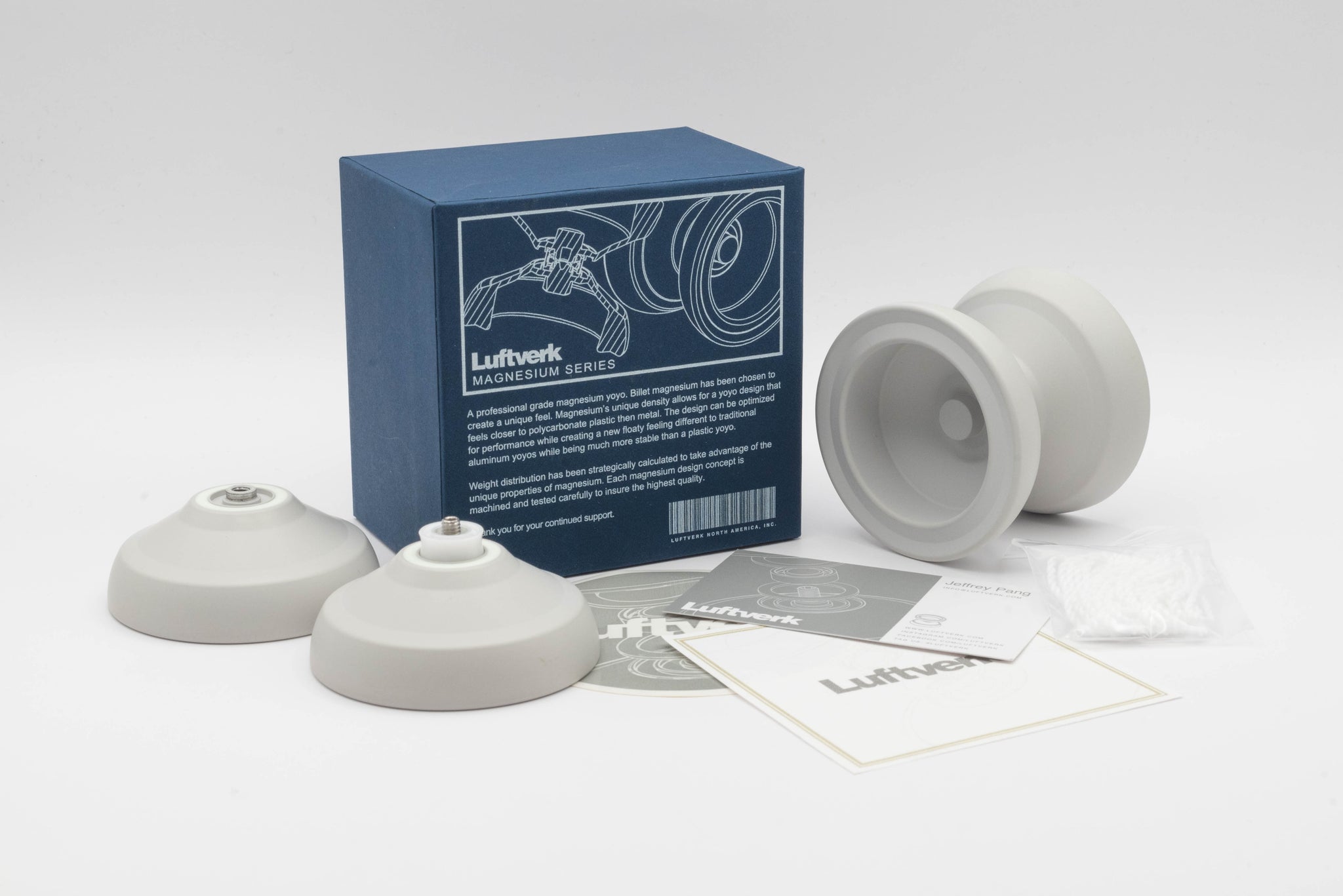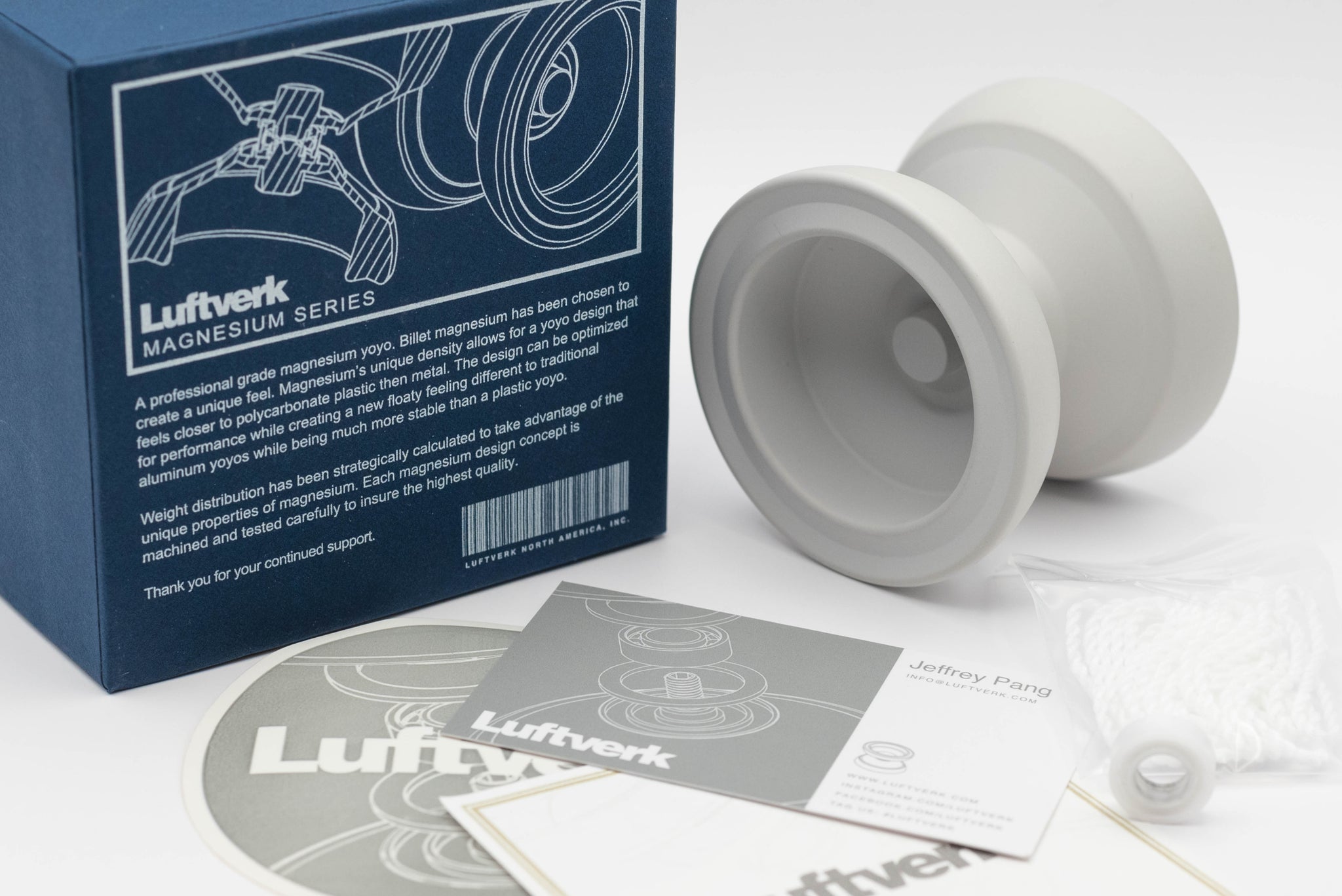 The yoyo is packaged with a new style box, creating a unique new experience for Luftverk customers. Every yoyo has a ceramic bearing included, as well as the newly designed sticker and business cards. This is a numbered limited product and likely will not be released again.